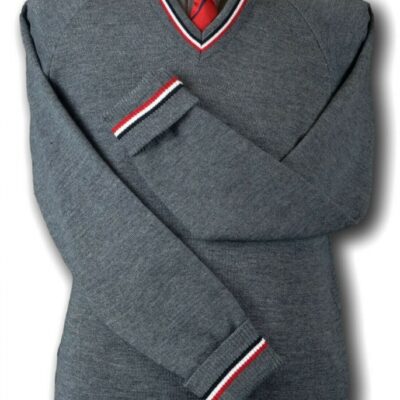 Students Uniform Grey School Uniform Jumper – Trim At The Neck In Red Black & grey