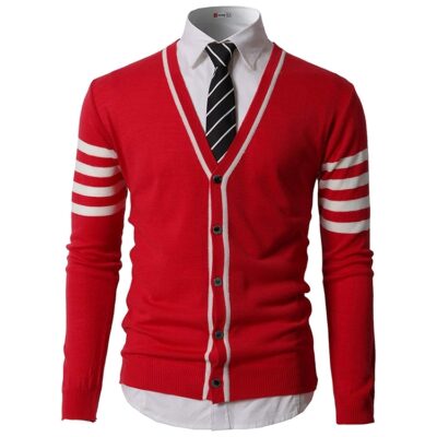 Fashion cardigan design single breasted cotton long sleeve men’s knitted varsity sweater coats with stripes