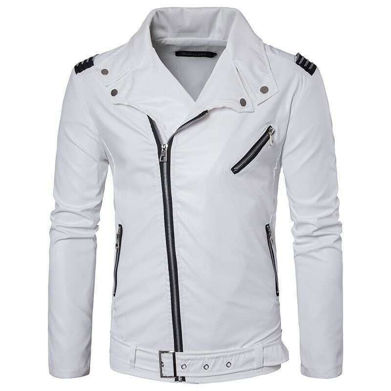 Men Leather Jacket White Motorcycle Punk Zipper Buckle Coat Outwear Slim Fit Lapel