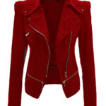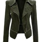 Our exquisite leather moto jackets are a perfect staple for your fall and winter wardrobe. It is precisely fit and constructed from the highest quality leather. The jacket has a large collar that buttons on the points with metal studs. It closes in front with a silver colored metal zipper. The length of the jacket can be elongated or shortened with a second metal zipper that zips horizontally around the bottom part of the jacket. It has long, close fitting sleeves. This jacket goes with virtually everything.